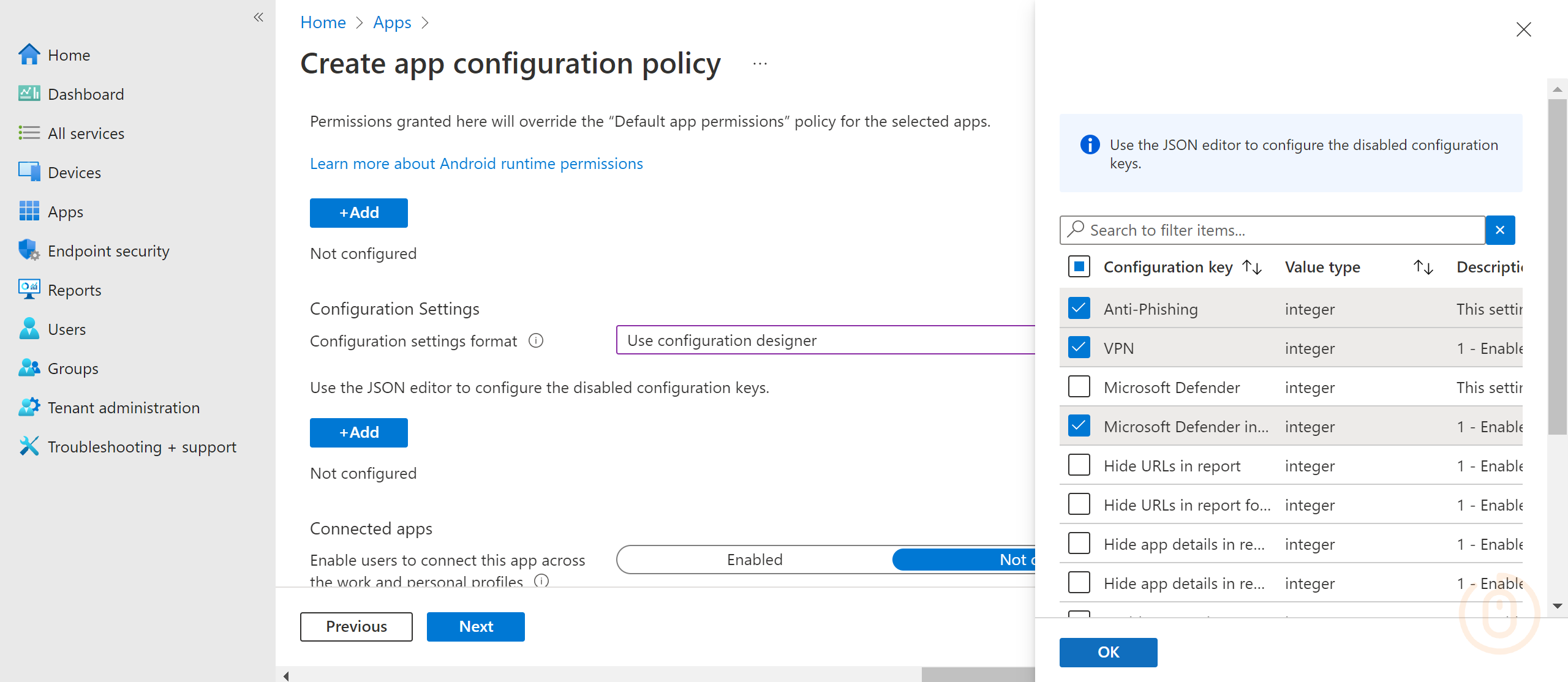 To make the onboarding process a little smoother, we can give the Defender app some of the permissions it’s asking for, so again update your App Configuration policy and add in the below permissions.