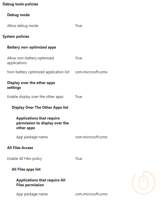 | System policies > All Files Access > All Files apps list | App package name | com.microsoft.scmx |