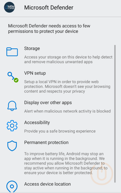 Defender for Endpoint on Android would use a VPN in order to provide the Web Protection feature. This VPN is not a regular VPN. Instead, it’s a local/self-looping VPN that does not take traffic outside the device.