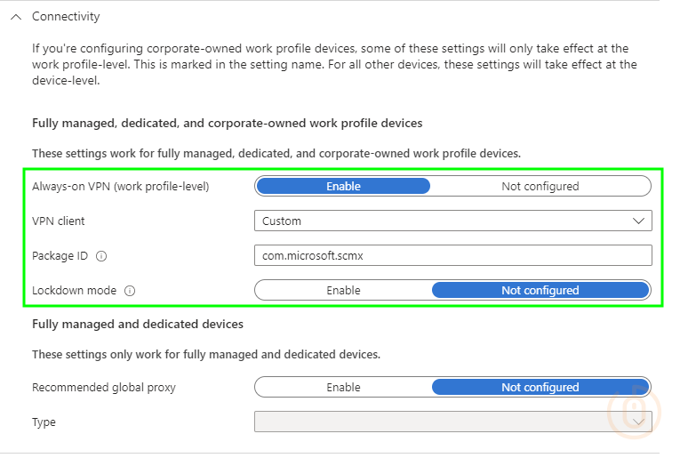 | Connectivity | Always-on VPN (work profile-level) | Enabled |