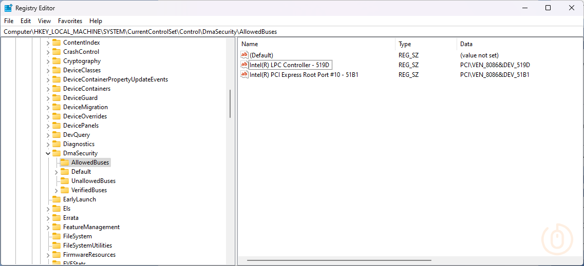 $regPath = 'HKLM:\SYSTEM\CurrentControlSet\Control\DmaSecurity\AllowedBuses'