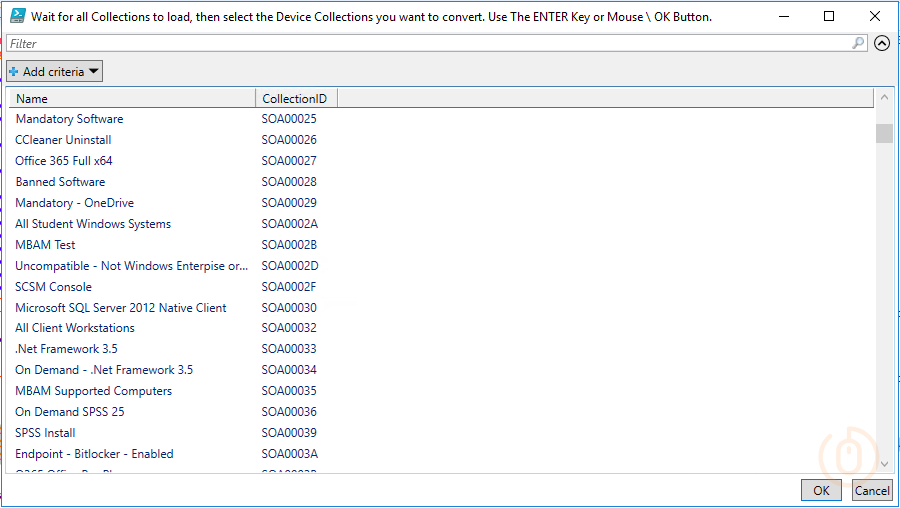 $Collections = @(Get-CMDeviceCollection | Where-Object { $_.CollectionRules -like '*SMS_CollectionRuleDirect*' } | Select-Object Name, CollectionID, CollectionRules | Out-GridView -PassThru -Title 'Wait for all Collections to load, then select the Device Collections you want to convert. Use The ENTER Key or Mouse \ OK Button.')