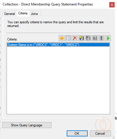 An easy replacement for the Direct Membership Rule is to use a List of Values Query based on System Name, so we’re going to use that, we’re going to use this as our basis for the new query once we’ve captured the Direct Members in a suitable format.