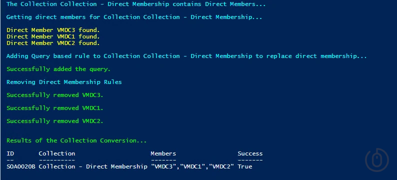 And after successfully creating the rule we can use Remove-CMDeviceCollectionDirectMembershipRule to loop through the existing Direct Members and remove them: