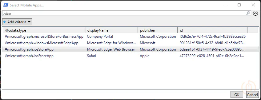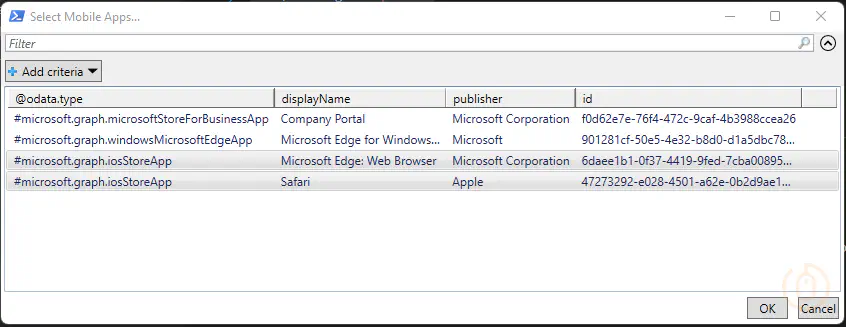 $MobileApps = @(Get-MobileApps | Where-Object { (!($_.'@odata.type').Contains('managed')) -and (!($_.'@odata.type').Contains('android')) } | Select-Object '@odata.type', displayName, publisher, id | Out-GridView -PassThru -Title 'Select Mobile Apps...')