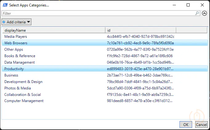 $AddAppCategories = @(Get-AppCategory | Select-Object displayName, id | Out-GridView -PassThru -Title 'Select Apps Categories...')