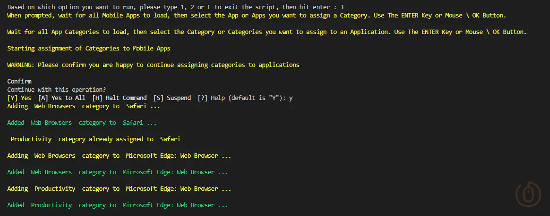 Write-Warning 'Please confirm you are happy to continue assigning categories to applications' -WarningAction Inquire