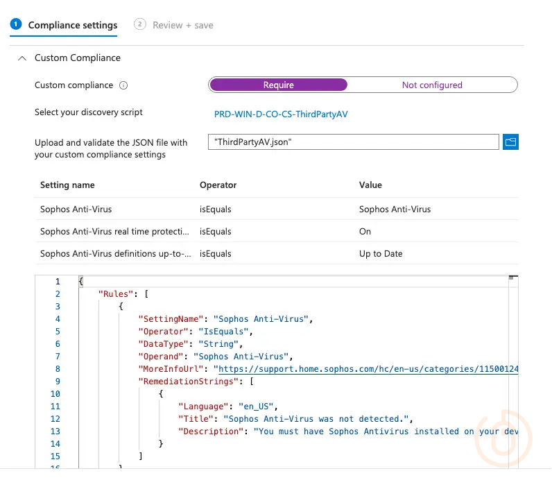 Following this, we can now create our Custom Compliance policy for Windows; select the previously created PowerShell script, and we’ll need to upload the JSON file created earlier.