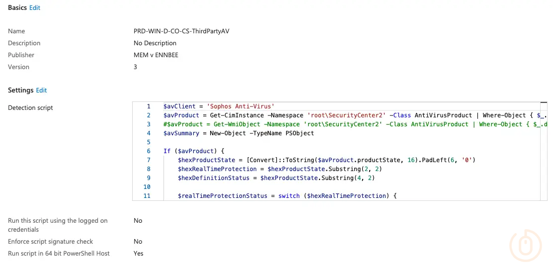 Running this script on a machine with the Antivirus product installed would be a good idea to test that the scripts works, and is outputting the correct information in the required format for Intune to translate.