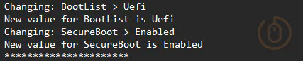 ./Set-BIOSSettings.ps1 -Settings BootList,SecureBoot -Values Uefi,Enabled