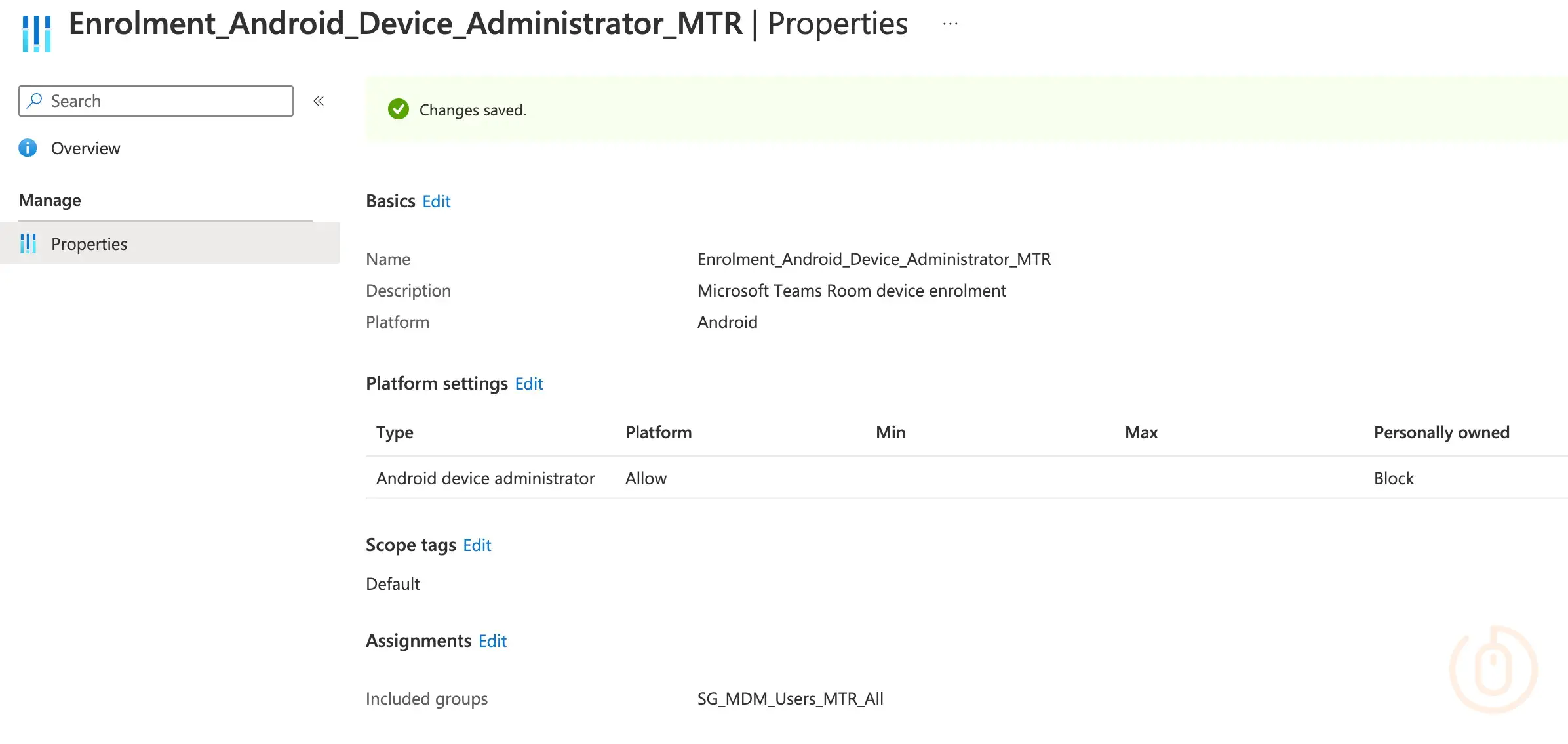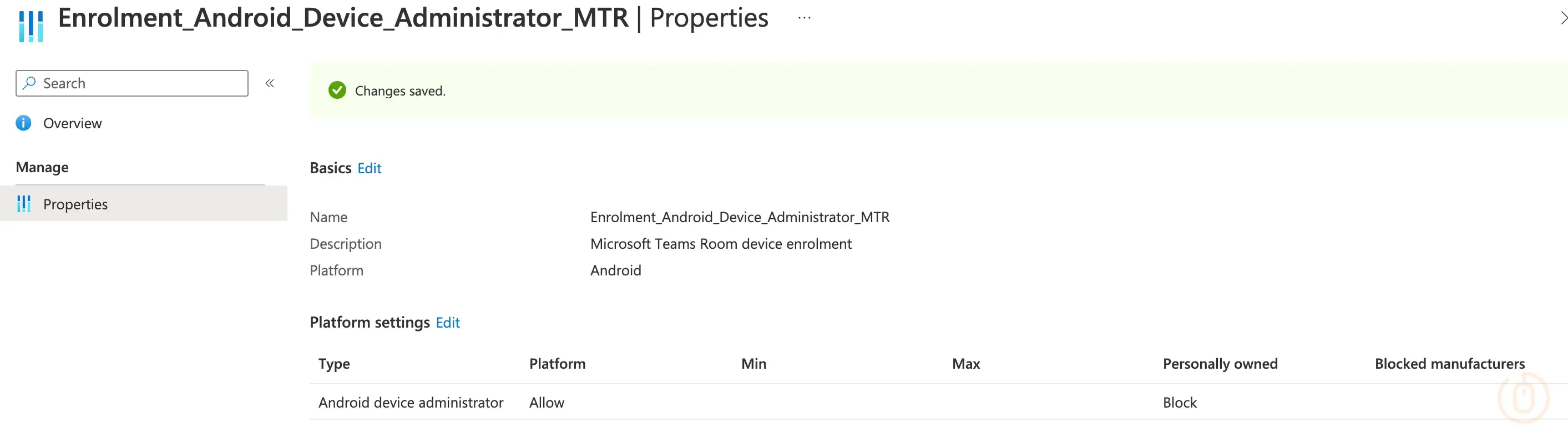 First off is creating an Enrolment Restriction profile that allows for Android Device Administrator enrolment, secondly is how we let Intune know that the devices are corporate owned, as they will be picked up as personal devices due to the enrolment method, and finally a way to capture all the MTR resource accounts together.