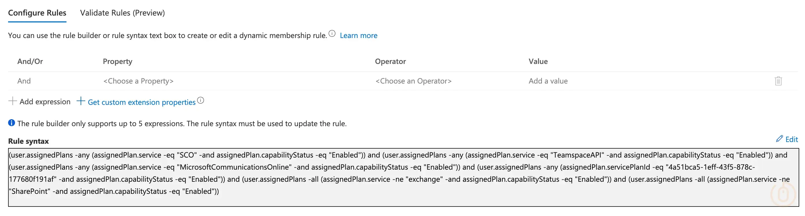 In the below example, the accounts didn’t have a Microsoft 365 Phone System license so the (user.assignedPlans -any (assignedPlan.servicePlanId -eq "4828c8ec-dc2e-4779-b502-87ac9ce28ab7" -and assignedPlan.capabilityStatus -eq "Enabled")) part of the rule was removed:
