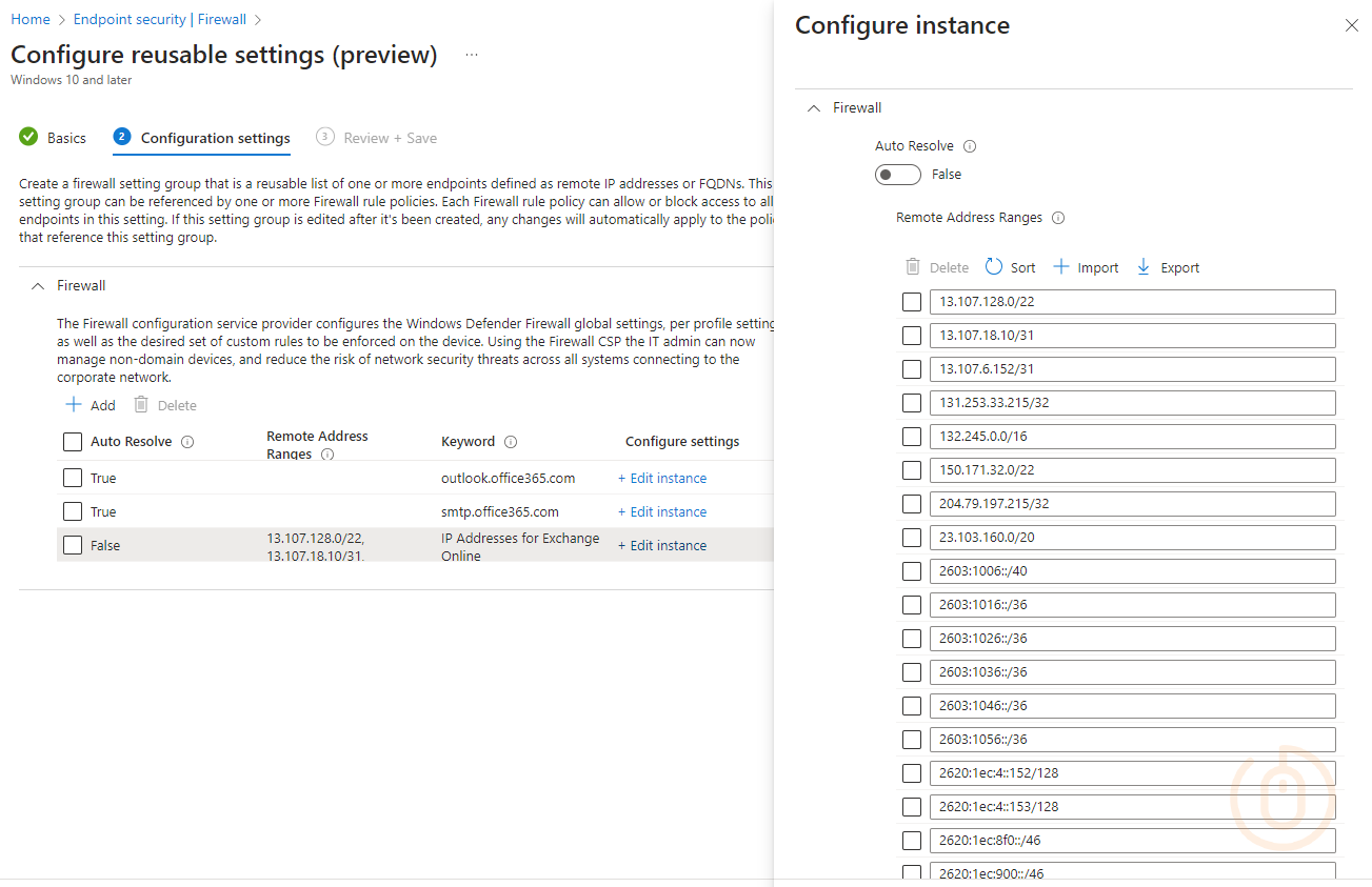 With the reusable firewall settings now in place in Microsoft Intune after being deployed using the script, you can use these groups in existing or new firewall rules policies that support reusable settings, allowing you to either configure a blanket allow all for the service areas, or be more specific and allow only the port requirements for each service area based on data provided by Microsoft in their web service.