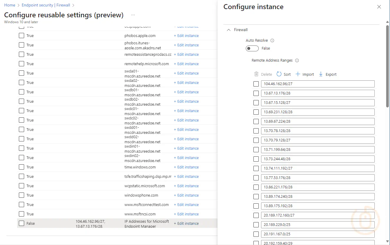 Digging into the Microsoft Endpoint Manager URLS and IPs setting, we can see that the URLs are and IP addresses are now contained within the reusable setting.