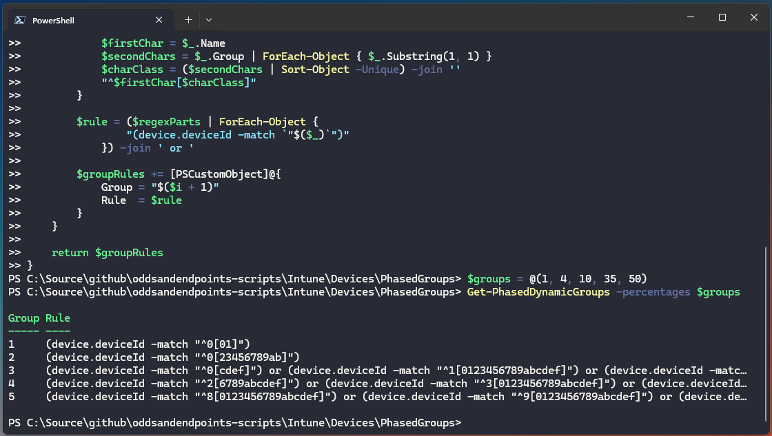 “Using powershell, i want to be able to split out dynamic entra device groups based on the device attribute device.deviceId which is a UUID, based on percentages. So if I want approx 5% of all devices for the first group, it would equate to devices where device.deviceId starts with 00, 01, 02, 03, 04, 05, 06, 07, 08, 09, 0a, 0b, 0cThen each subsequent group is 15%, 25%, 45% of devices. give me the logic and the powershell script to able to use dynamic group membership percentages, ensuring for n groups the total adds to 100, and to make sure that no device is missed from any of the dynamic groups, so all device.deviceId are covered by only one dynamic group query”