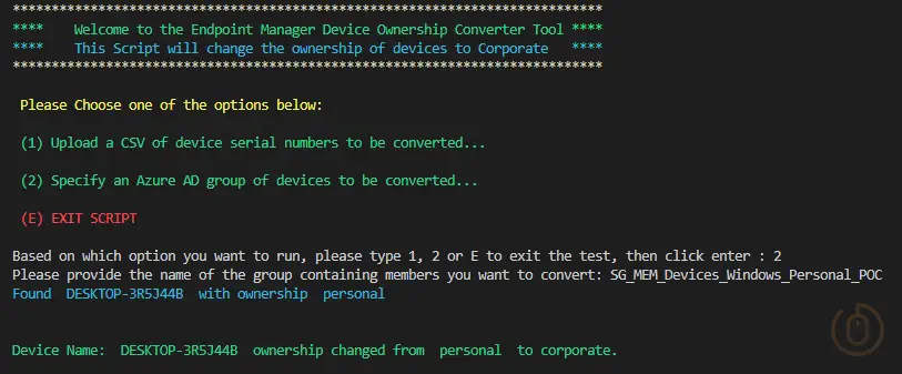After this, the script will just do it’s thing and go and get each device in either the CSV or the group, change the ownership, and then tell you about it: