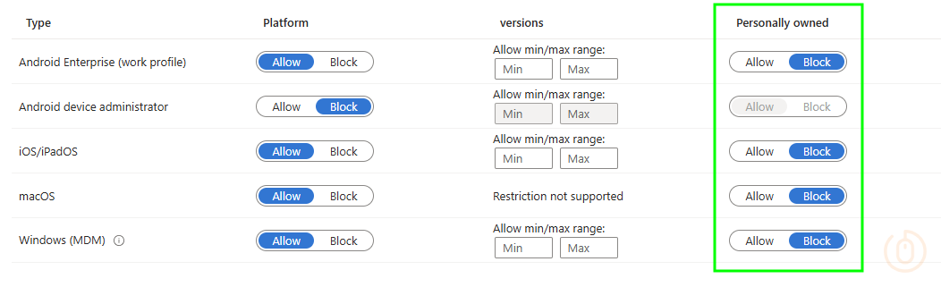 Blocking all personal Windows devices is pretty easy, just go update the Default Enrolment Platform Restrictions in Intune, flipping the Personally owned slider to Block, and that’s it no more Windows BYOD.