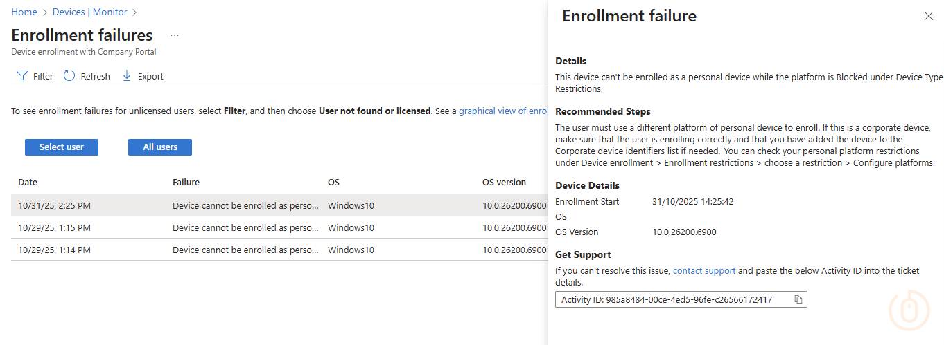 Making sure all of this wasn’t just a fluke, we can check in Intune under Devices > Monitor > Enrollment failures to confirm that the Windows Home device was blocked.