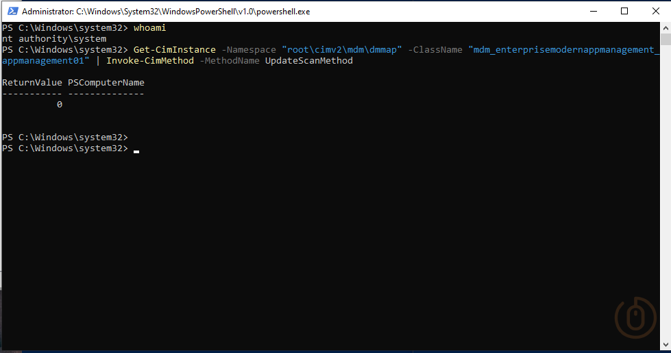 Get-CimInstance -Namespace "Root\cimv2\mdm\dmmap" -ClassName "MDM_EnterpriseModernAppManagement_AppManagement01" | Invoke-CimMethod -MethodName UpdateScanMethod