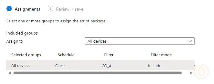 I’ve assigned this to the All Devices group, but with a Device Filter for only corporate owned devices, set to run once, as we’re just reporting on this issue for now.