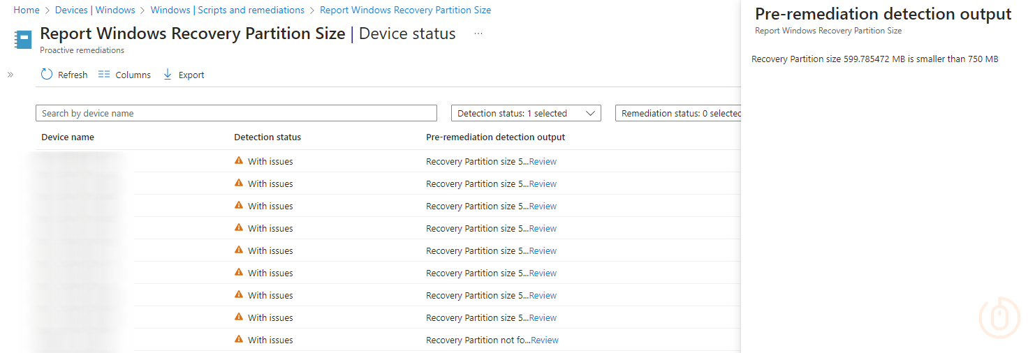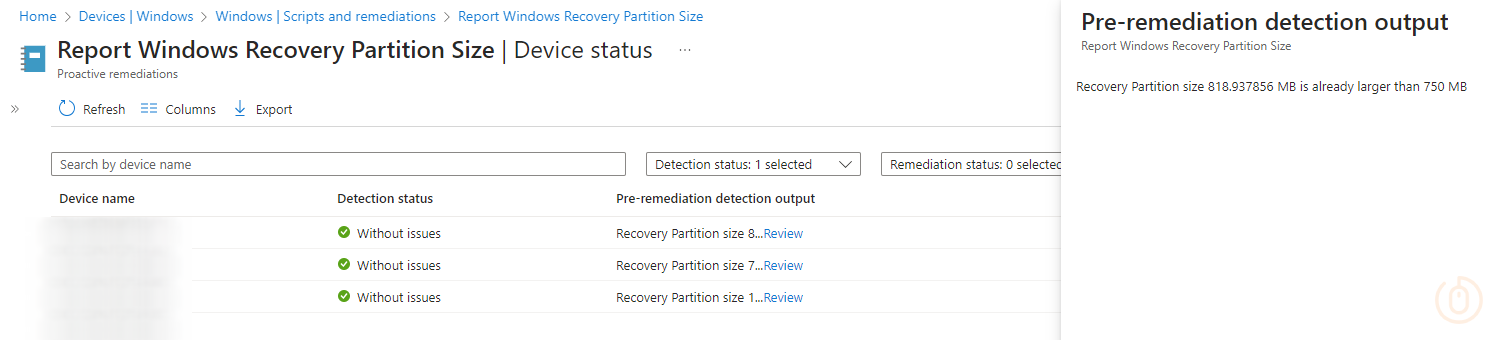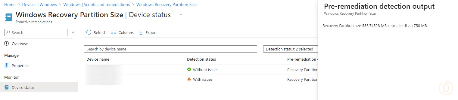 If we’ve been successful in our deployment we should start seeing device report back the status of the remediation, and advise where there are issues with the size of the WinRE partition.